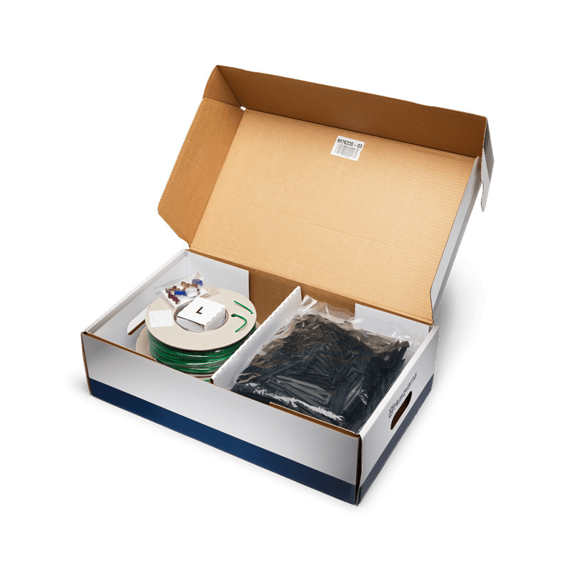 Telepítő készletek, melyek az Ön kertjének megfelelő, különböző számú és hosszúságú határolóvezetéket, rögzítőtüskét, zsírszigetelésű és egyéb csatlakozót tartalmaznak.